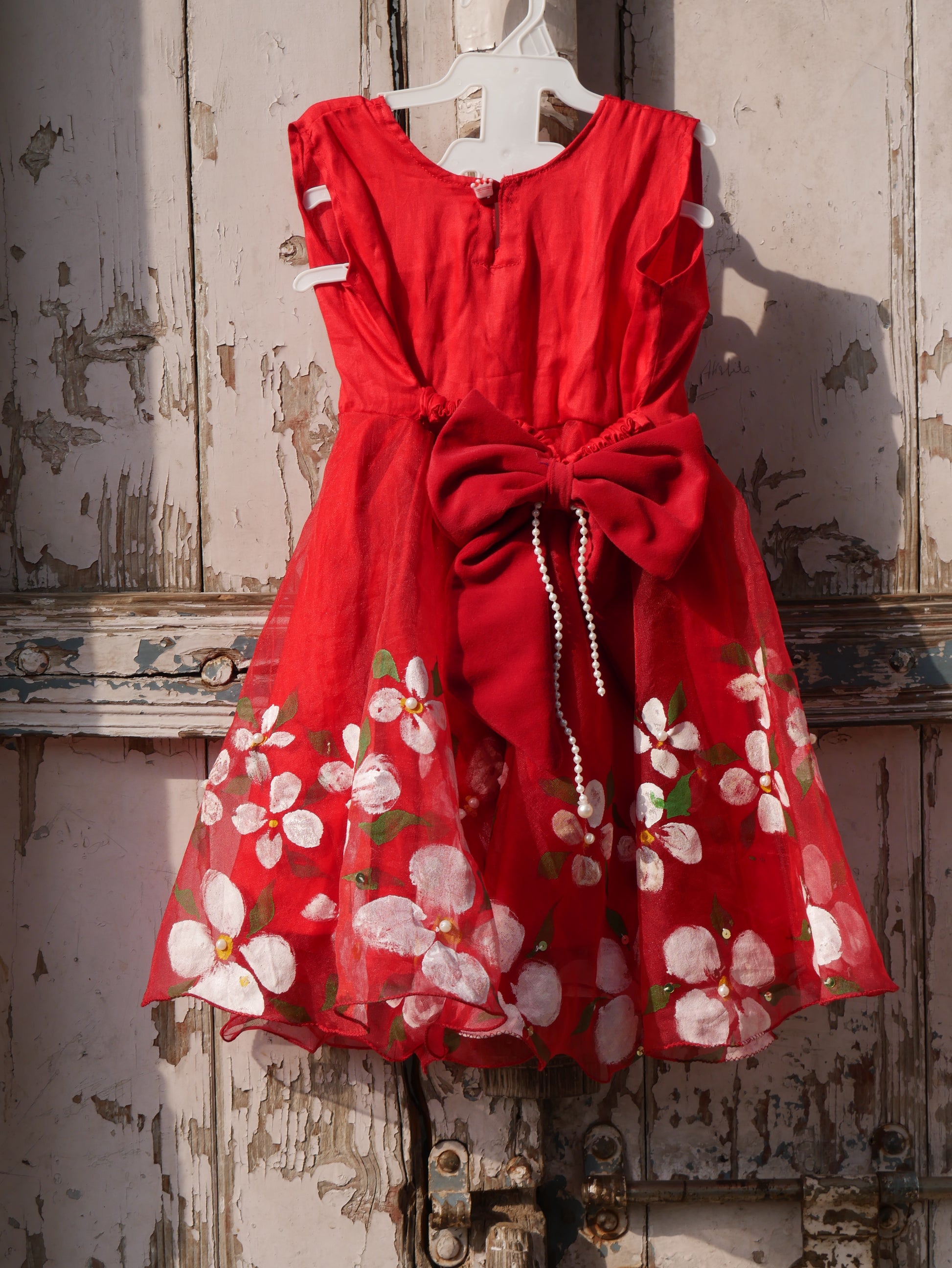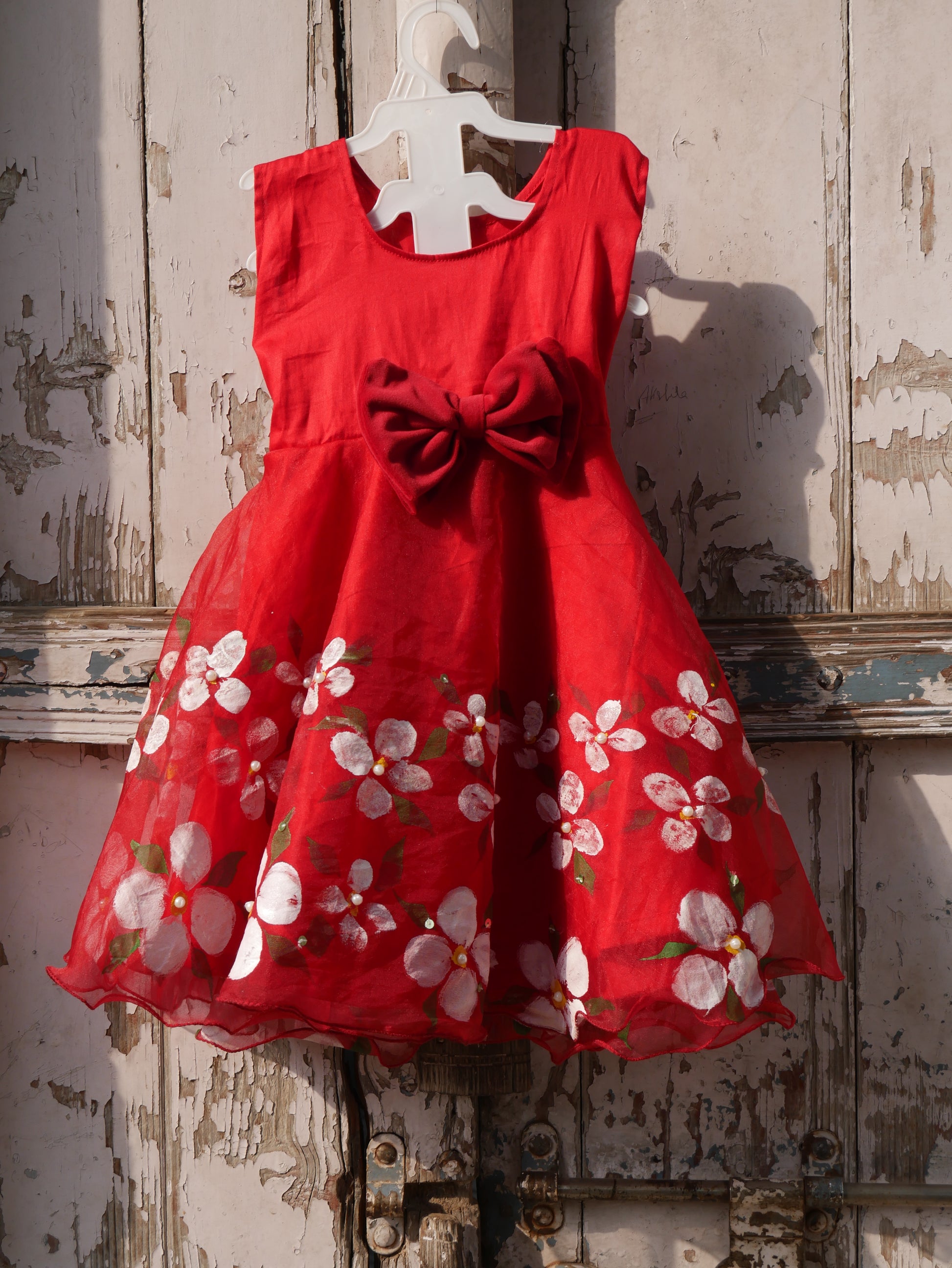 Charming handpainted toddler frock made with pure cotton and soft organza, ensuring a skin-friendly and breathable fit. This elegant design is perfect for weddings, parties, haldi, or mehndi functions—combining comfort with festive flair for your little one.