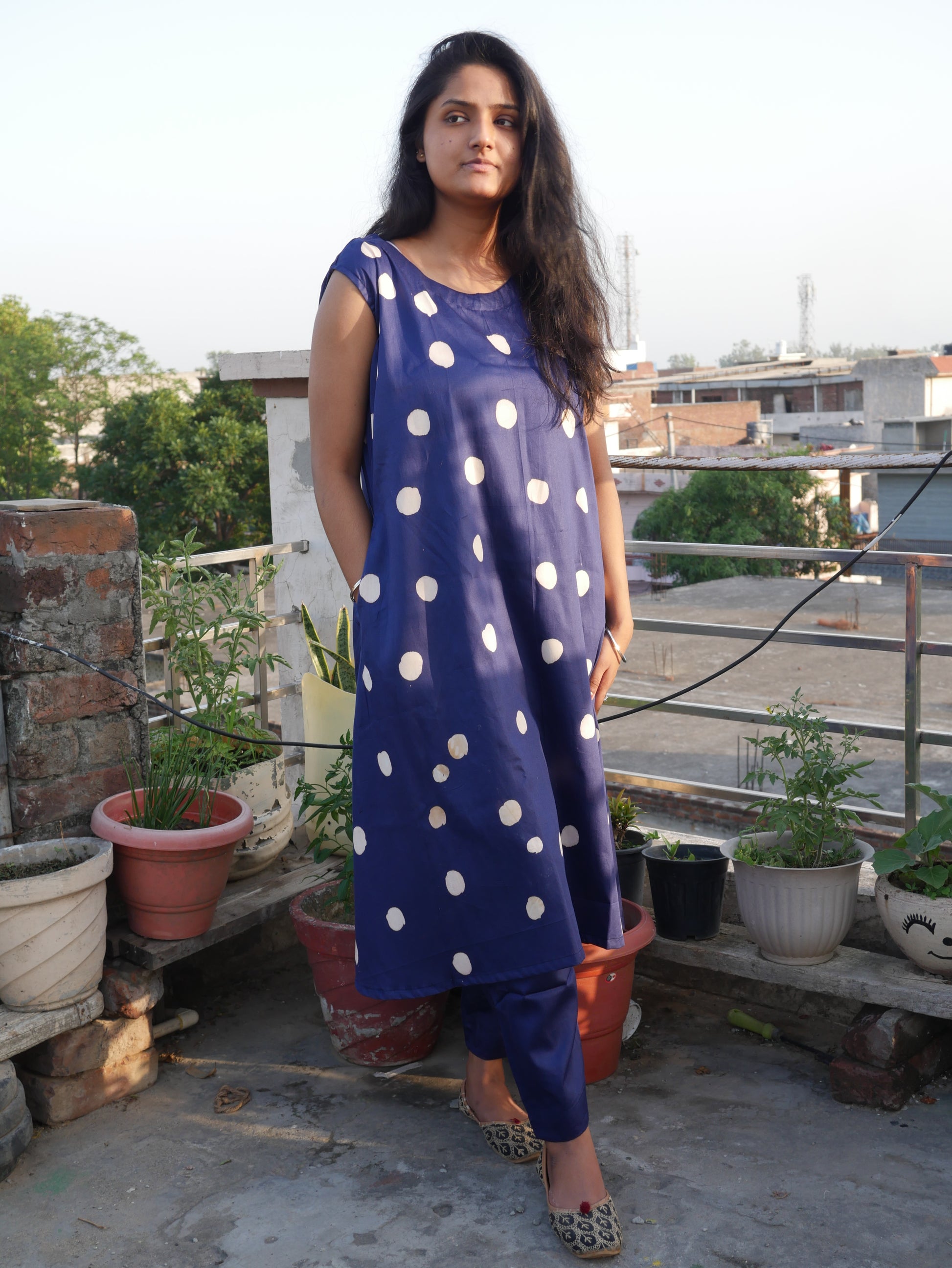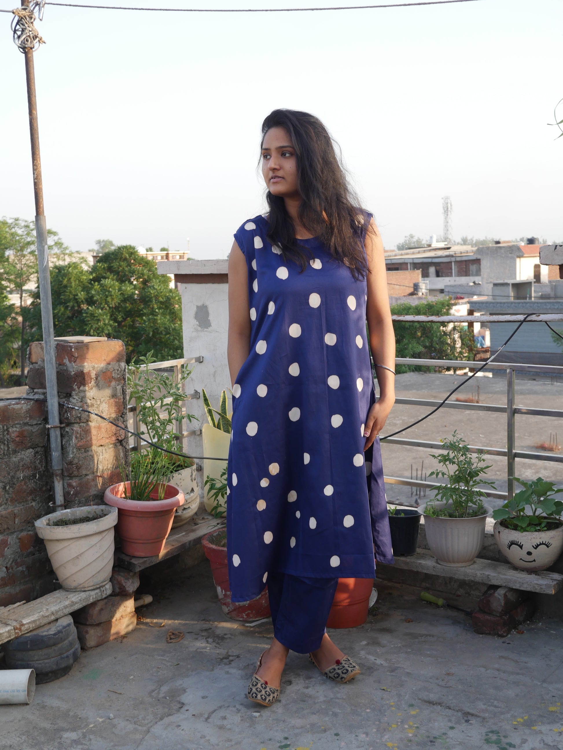 A-line kurti crafted in pure cotton featuring timeless polka dots and a smart side pocket for added functionality. Paired with a matching cotton trouser, this set is breathable, elegant, and perfect for effortless everyday wear. Ideal for summer days, workwear, or casual outings.